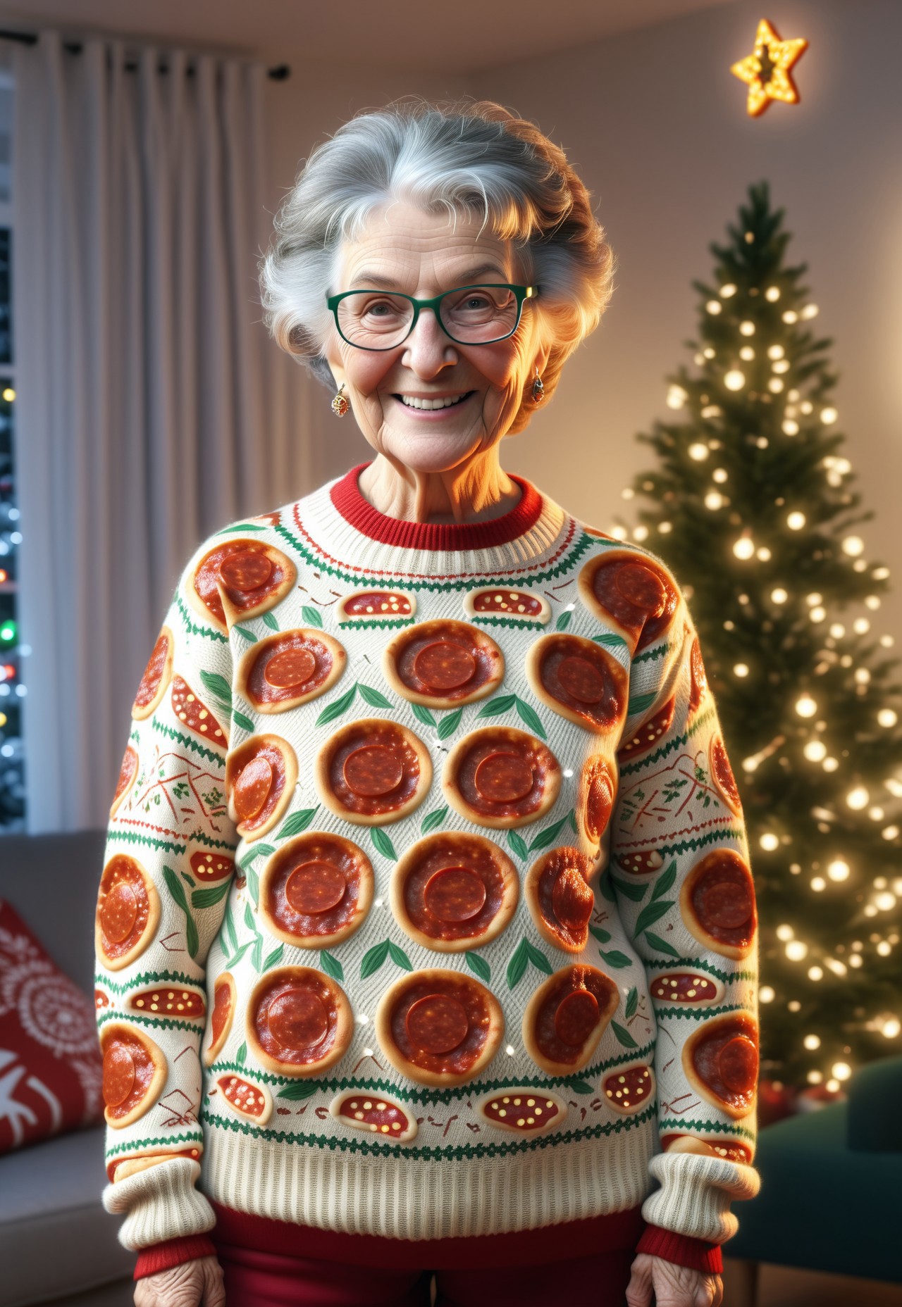 wholesome granny wearing pizzasdx sweater, looking at viewer, smile, christmas tree, christmas lights, living room