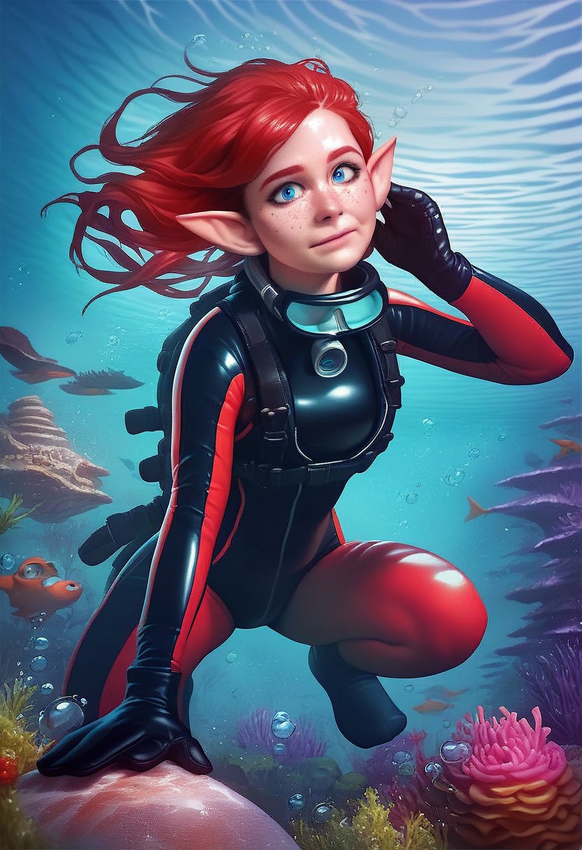JDStyle, , score_9, score_8_up, score_7_up, red haired female elf scuba diver swimming underwater in the ocean in a full black wetsuit, realistic skin, masterpiece, raw quality, best quality, extremely detailed, stunning beautiful, freckles, blue eyes, crouched