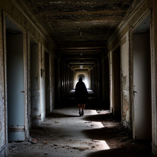 RAW photo, screaming creature at the end of hallway, 8k uhd, dslr, soft lighting, high quality, film grain, Fujifilm XT3, Masterpiece, photorealistic, abandoned hospital, looking down hall way,