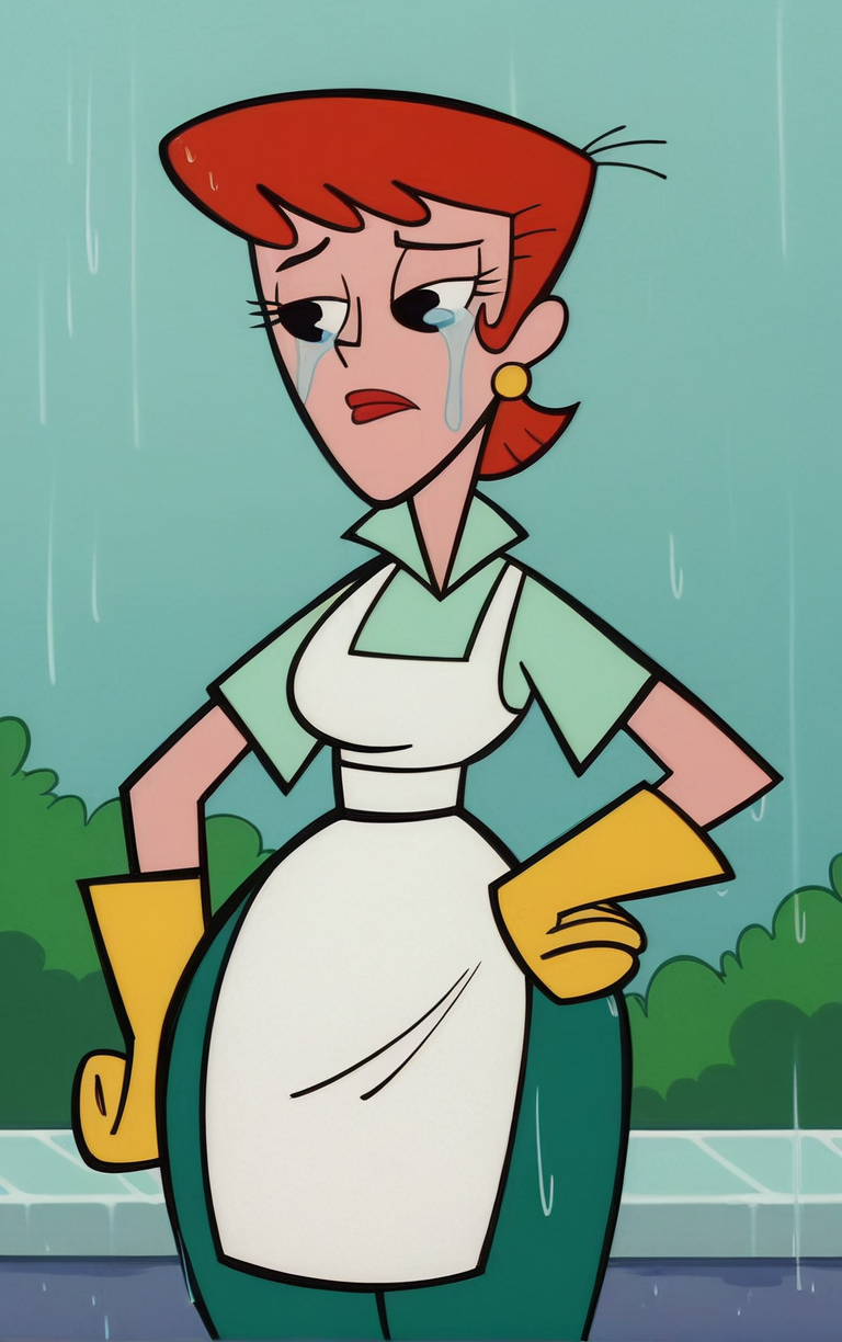 score_9, score_8_up, score_7_up, BREAK MainOutfit_DextersMom_ownwaifu, 1girl, aqua shirt, breasts, collared shirt, earrings, eyelashes, green leggings, narrow waist, oven mitts, red hair, red lips, short hair, thick thighs, white apron, wide hips, yellow gloves, jewelry, lipstick, makeup, apron, black eyes, short sleeves, (portrait, rain, sad), crying, waterfall, wet, wet clothes, closed mouth, hydrangea, outdoors, <lora:PONYXL_MOM_DextersMom_ownwaifu:0.75>, solo,