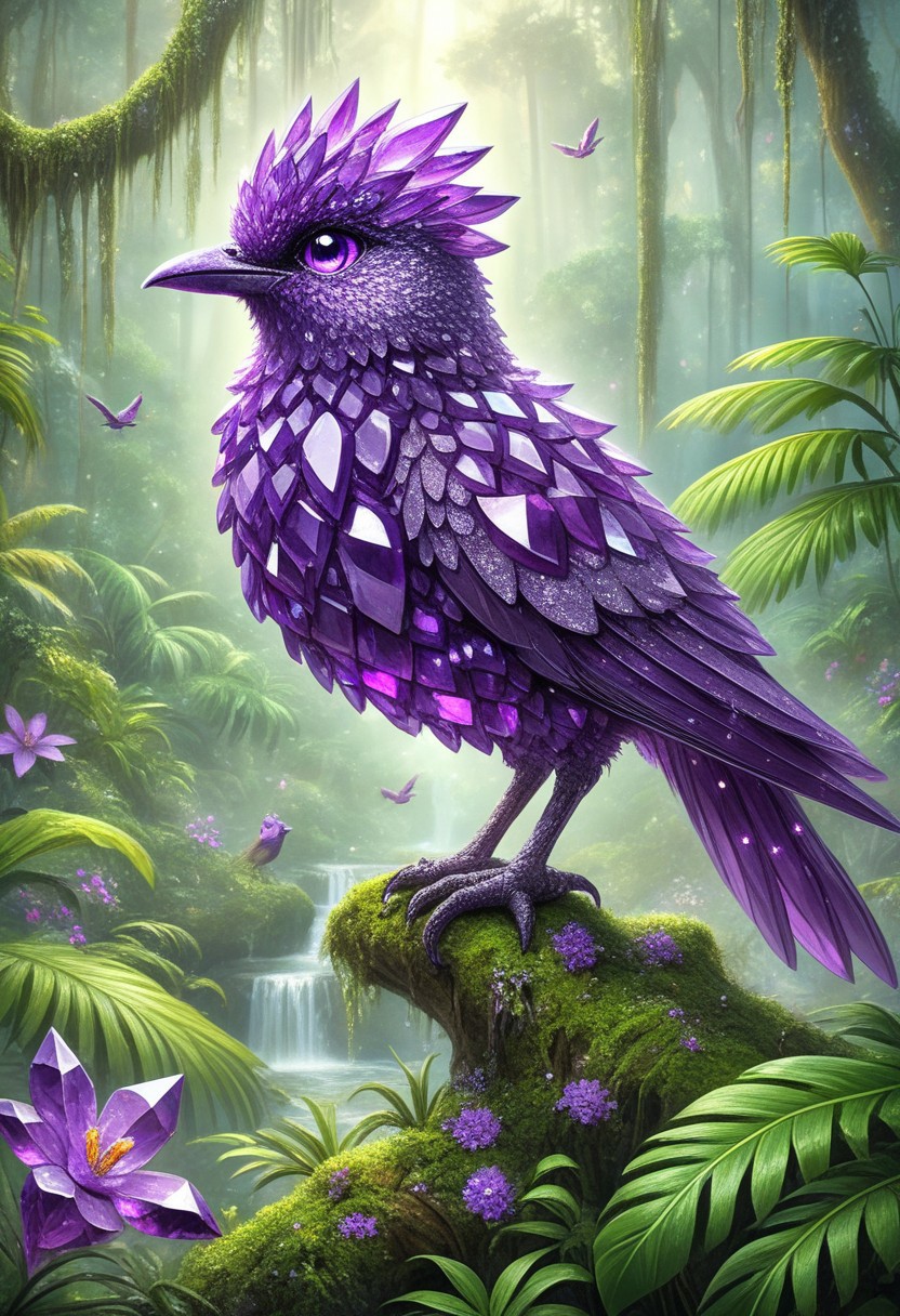 masterpiece, perfect quality, best quality, absolutely eye-catching, made of sparkling amethyst crystals, Rating_PG. A misty rainforest, living magical bird