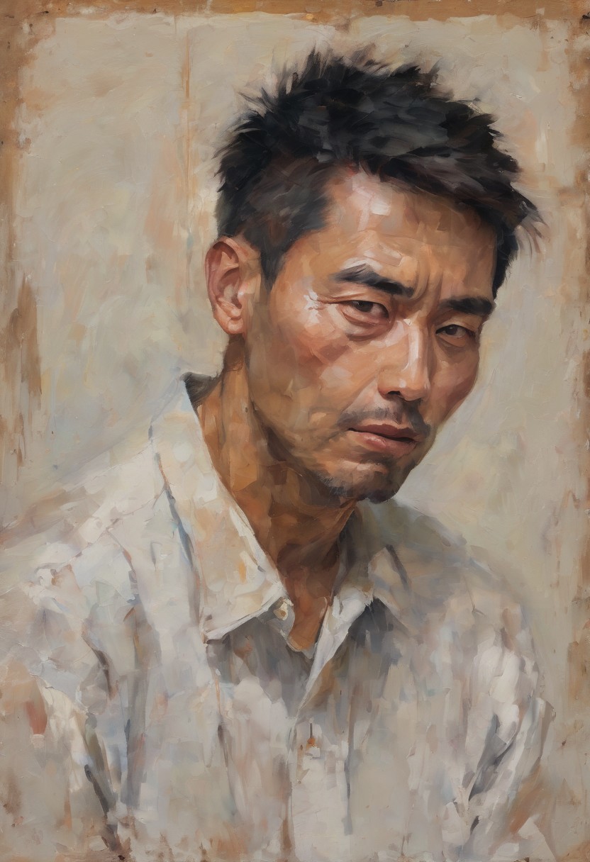 painting style, Oil painting, portrait of young japanese man, old dirty shirt, skinny body, lifeless eyes, focus on face