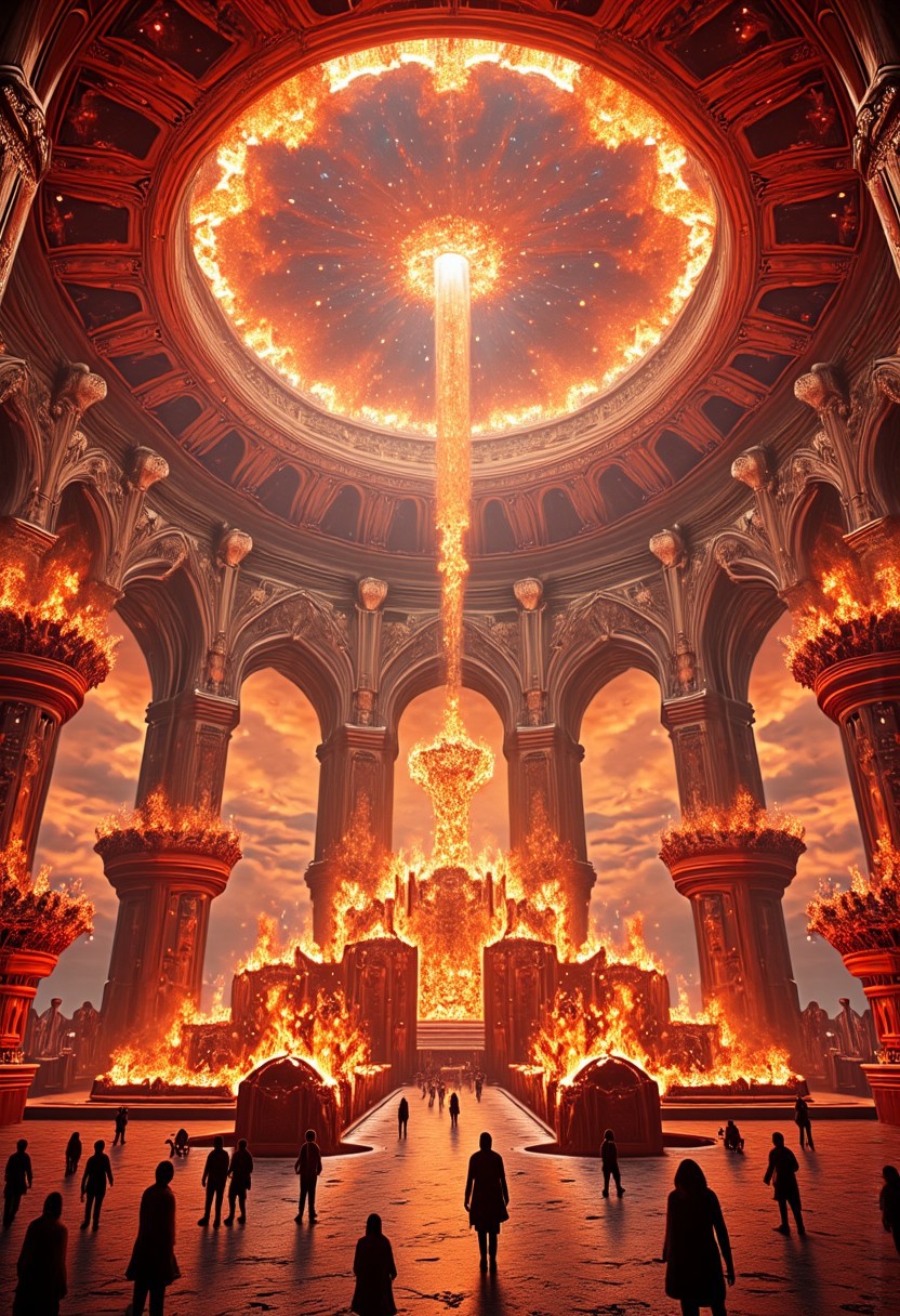 But horrors portioned to a giant nerve Oft made Hyperion ache His palace bright Bastioned with pyramids of glowing gold And touched with shade of bronzed obelisks, Glared a blood-red through all its thousand courts Arches and domes and fiery galleries And all its curtains of Aurorian clouds Flushed angerly while sometimes eagle's wings Unseen before by Gods or wondering men Darkened the place and neighing steeds were heard Not heard before by Gods or wondering men, high quality, detailed