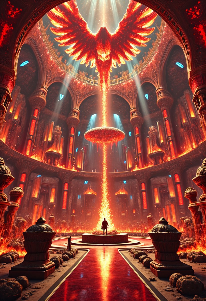 But horrors portioned to a giant nerve Oft made Hyperion ache His palace bright Bastioned with pyramids of glowing gold And touched with shade of bronzed obelisks, Glared a blood-red through all its thousand courts Arches and domes and fiery galleries And all its curtains of Aurorian clouds Flushed angerly while sometimes eagle's wings Unseen before by Gods or wondering men Darkened the place and neighing steeds were heard Not heard before by Gods or wondering men, high quality, detailed