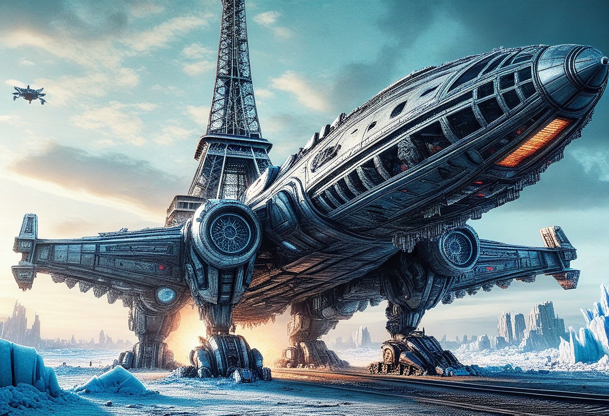 RAW photography, cinematic, science fiction theme, ( an ultra realistic futuristic military spaceship is landing:1.4), ground view of 2077 landscape of a frozen futuristic Paris, haussman architecture, Grand Palais, Le Louvre, Notre Dame, post apocalyptic city, survivors basecamp, little fires, shanti town, great composition, heavy snowing, rules of third, organic city , (ultra realistic:1.2), photorealistic, color graded cinematic, dramatic light, pale sunrise, cinematic lighting, battered, low angle,8k, hyper realistic, focused, extreme details, unreal engine 5, Every element is rendered in extreme quality, aiming for an ultra-HD 8K resolution level of detail. The cinematic and hyperrealistic style makes it feel like a freeze-frame from a high-budget dark fantasy film. The use of film grain adds a texture that gives the scene a gritty, realistic feel