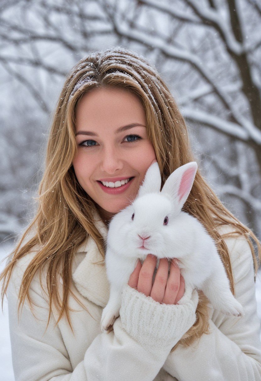sexy, smiling 20yo girl holding a white rabbit in the snow