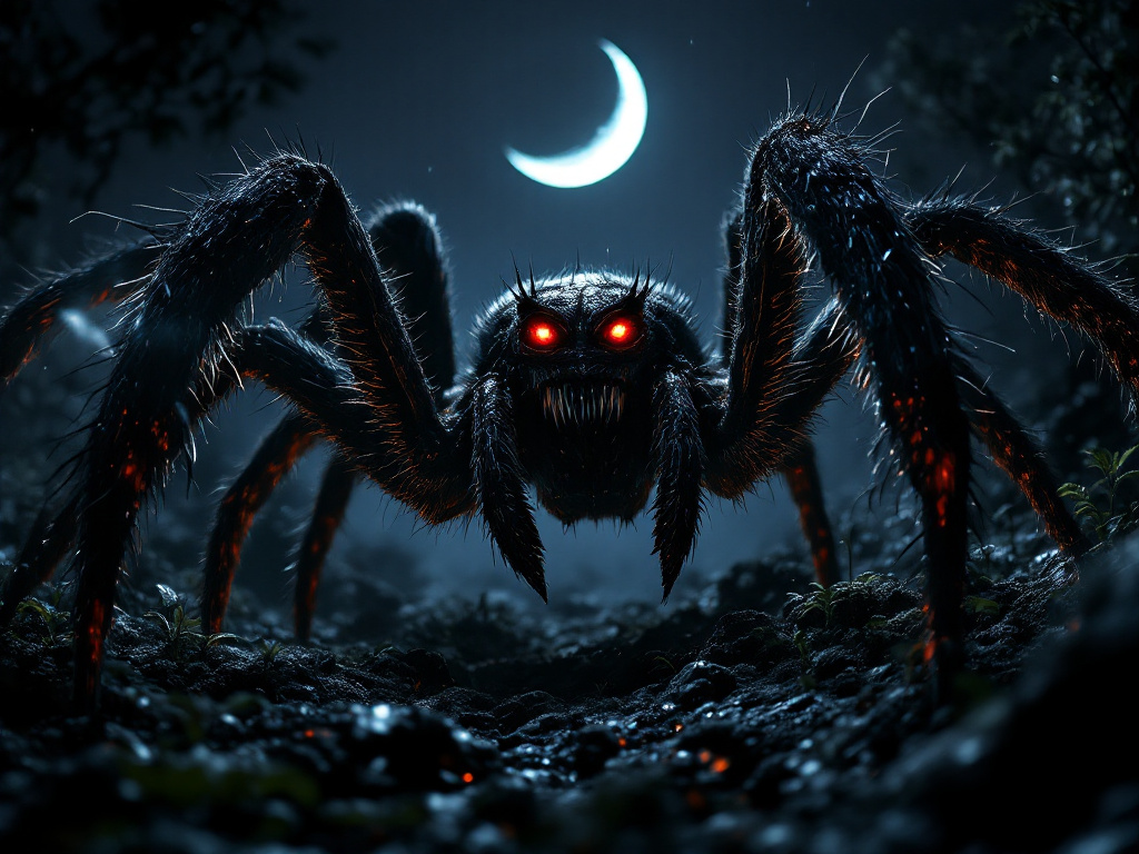 Close up shoot of a giant wolf spider dramatic light . Night scene . Ultra details.