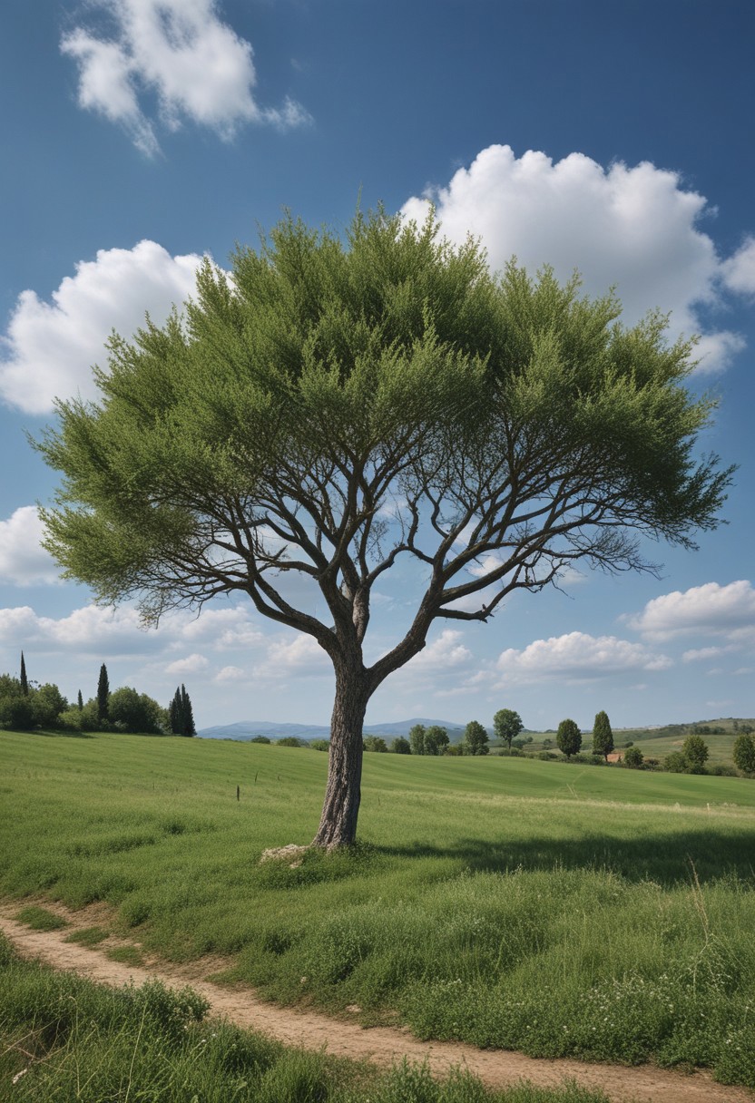 masterpiece, photorealistic, italian countryside, sparse trees, wispy clouds, uninhabited,