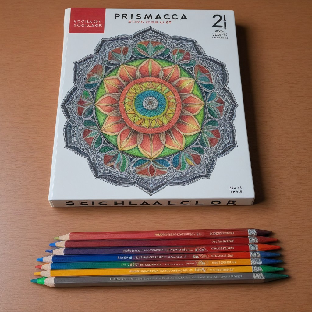 “Prismacolor Scholar” colored pencils (Box of 24), with an open mandala book which has started to be colored, pencils next to the book