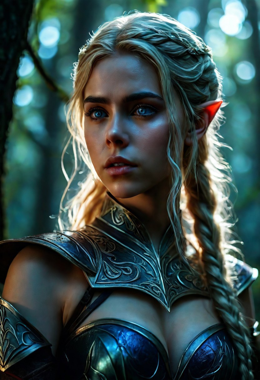 High resolution of ultra-realistic Beautiful Elf Warrior girl, ultra-realistic body, perfect athletic body, Attractive Elf girl, artgem, WLOP, sitting spread-legged on a stump in a dark forest, beautiful Kiernan Shipka as Elf Warrior girl, night of the full moon, realistic elven leather armour, pointed elf ears, defiant and seductive, covered in dirty and blood, cinematic colors Lighting, extremely detailed, 8K, wavy blonde hair, realistic dirty pale face, realistic blue eyes, beautiful Elf girl on in dark fantasy cool outfit, hyper-detailed, hyper-realistic, Attractive 21 old years Elf woman, Attractive, beautiful firm Breasts, wet and sweaty skin, Dark fantasy style, Dark fantasy atmosphere, sharp focus, digital painting, Photograph Taken on Nikon D750, Alphonse Mucha, 8K, athletic figure, Hyperdetailed, hyperrealism, attractive woman, beautiful woman of athletic body, Attractive bust girl, asymmetric balance