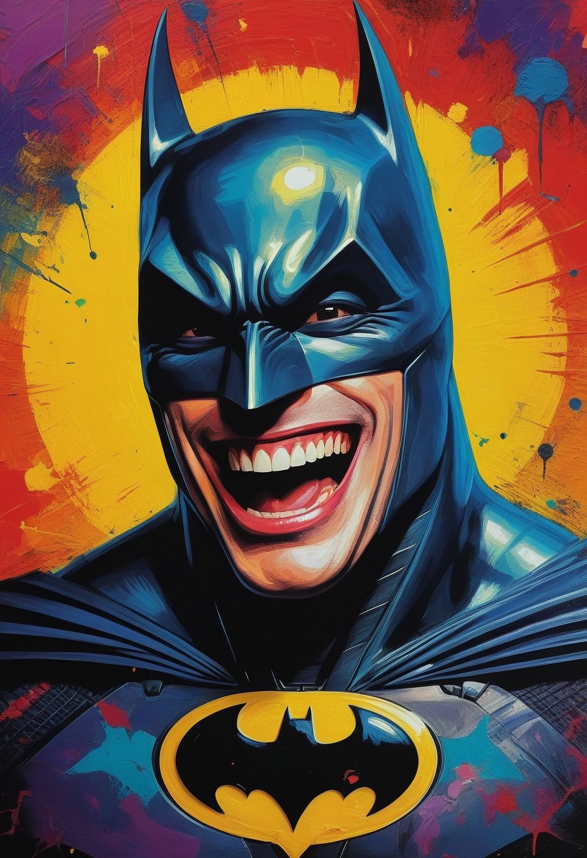 Centered, Incredibly Detailed Accurate Picture Of Super funny surreal pop art laughing Batman vibrant colors, clean oil ink airbrush painting illustration, pallet knife effect