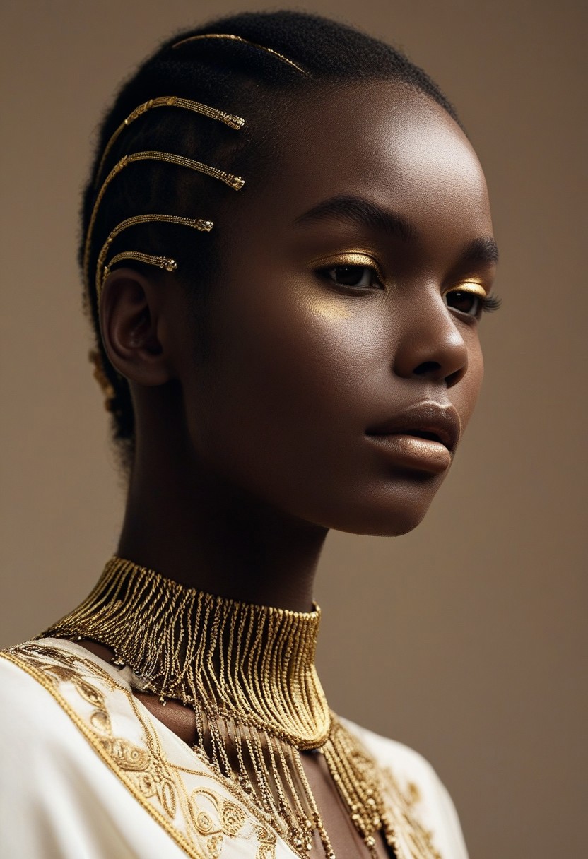 close-up portrait of a beautiful african model, with strikingly intense brown eyes. The person is wrapped in a textured, light-colored cloth (resembling ivory or off-white) adorned with gold accents. The facial adornments include intricate gold designs resembling filigree or mechanical elements, placed symmetrically across the forehead and cascading slightly over the face. The gold accents seem to blend organically with the fabric and skin, creating a celestial or futuristic aesthetic. The overall tone is soft, with the gold elements providing vibrant contrast against the pale hues of the skin and fabric. The style combines elements of fantasy and modern art, evoking a sense of mystery and elegance.