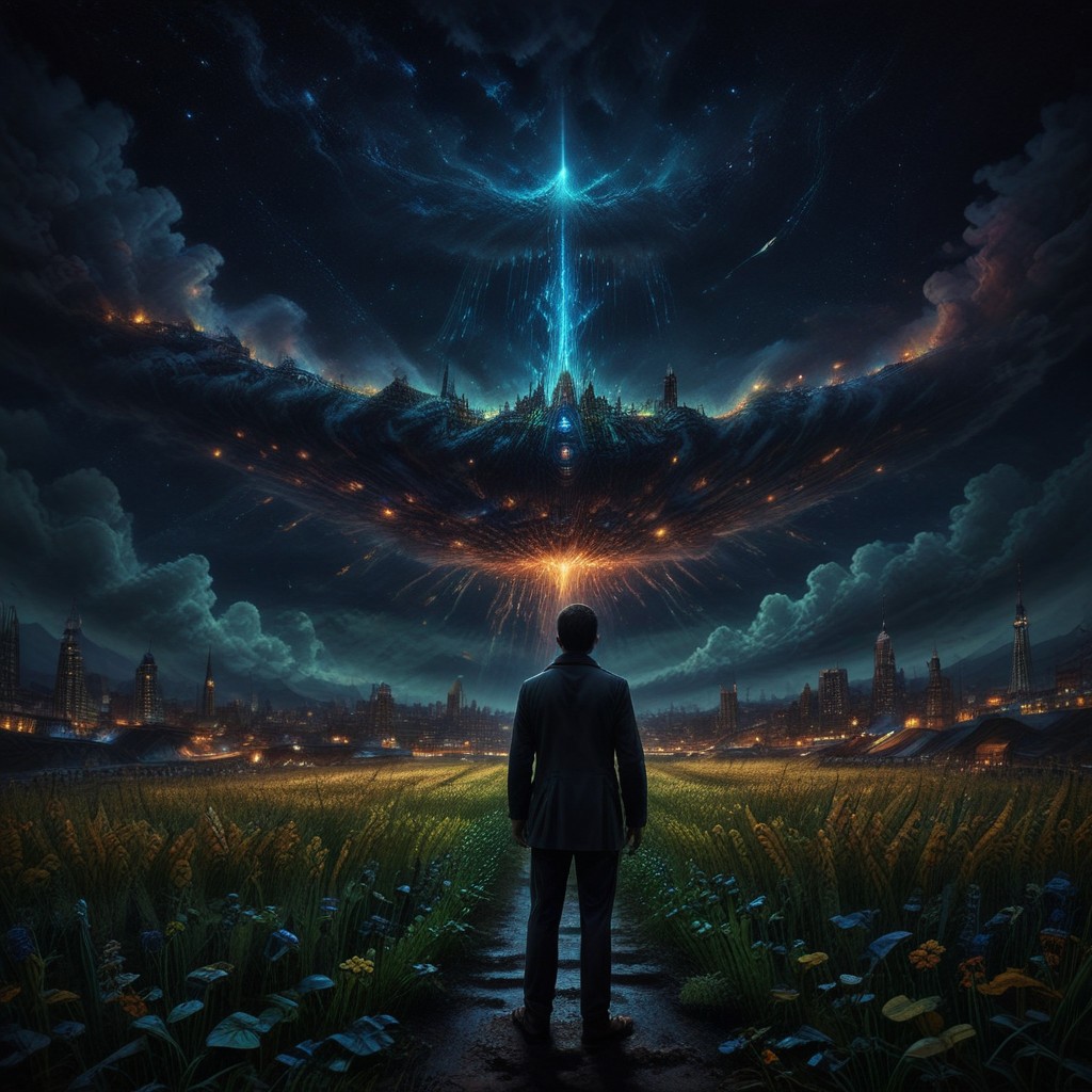 Ultra realistic color pencil image of a man standing in the middle of a field on a cloudy night, watching a city-sized spaceship descending in the background. Only light comes from the spaceship. silhouette style, BREAK Deep dark intense midnight blue misty background , Dark theme, dynamic lighting, (soft shadows), (soft focus), (photo realistic), uhd, 8k