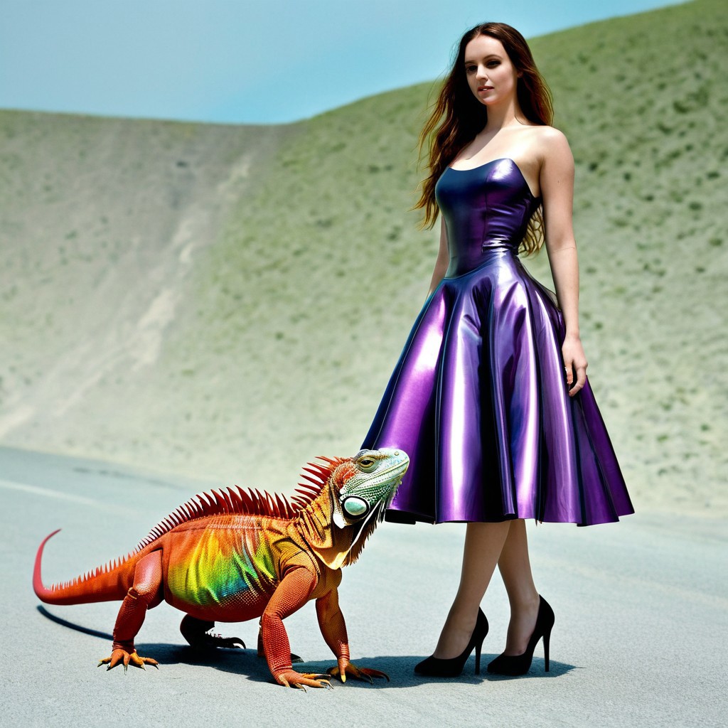 (photo-realistic high resolution, Focus full body, 1 young woman ((((walking a multicolor iguana)))), hoopdress in latex (((rainbow_multicolor glossy very_shiny))):1.6), (looking at viewer, ((((full-length image (((front facing))), from a great distance)))):1.4), perfect proportions, very long bold golden reddish hair , wide open hazel eyes, sharp focus, realistic skin, slim, tall, very high heels