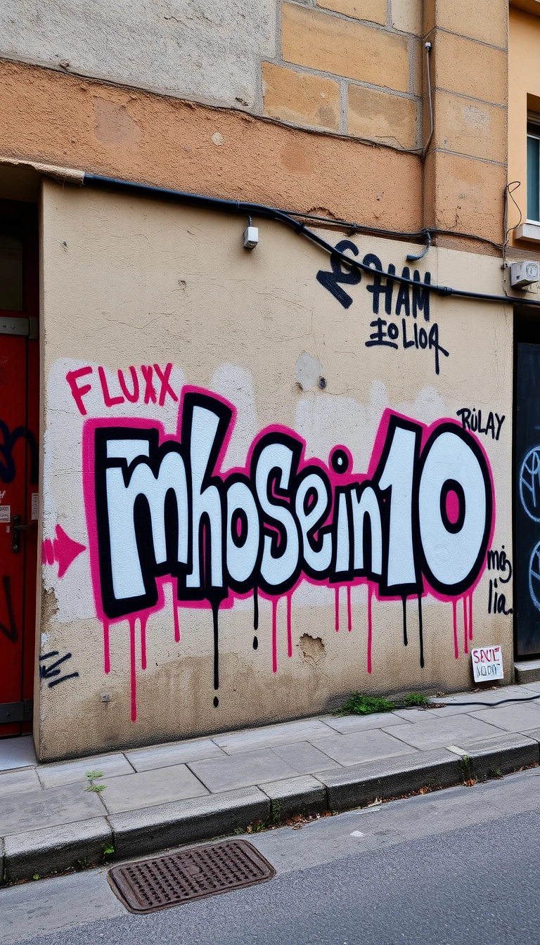 styleStylized graffiti on a detailed wall of a Flux No LoRa city street with the text ”mhosein110”