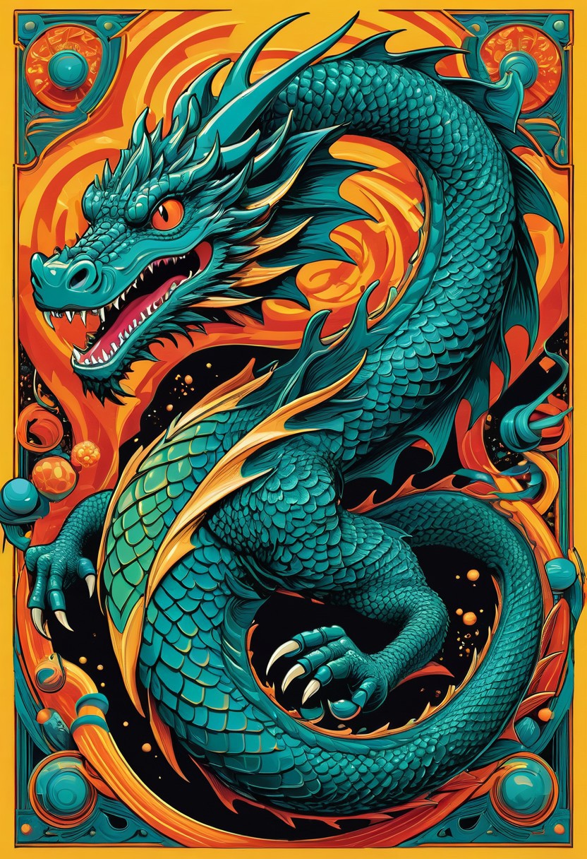 Centered, A vibrant, old-school dragon amidst a swirling vortex of abstract shapes, set against a backdrop of bold, contrasting colors, reminiscent of the styles of M.C. Escher, Ed "Big Daddy" Roth, and Vaughn Bodé. The dragon is adorned with intricate, fine details, including twisted rope and anchors, in a mesmerizing display of complementary colors, with shades of turquoise, orange, and yellow, blended in a stylized, hand-drawn manner, evoking the dynamic energy of classic gaming art and psychedelic posters.