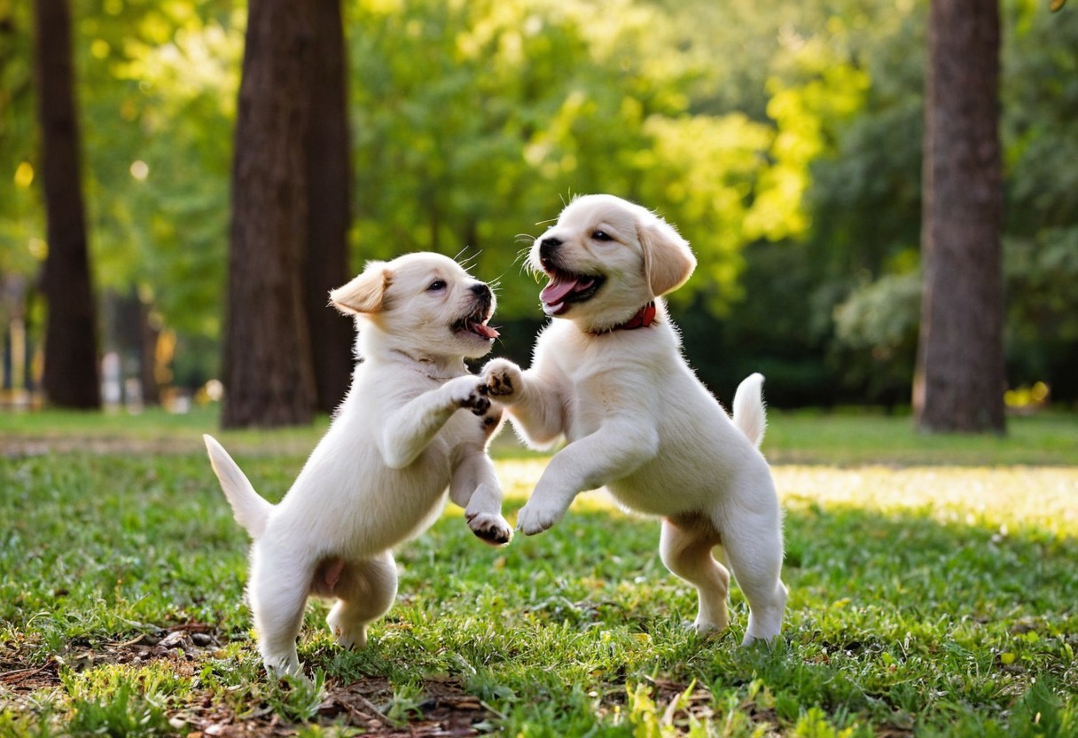 Two cute puppies playing together, photo, excited, happy, young, puppy, park, sunny day, trees