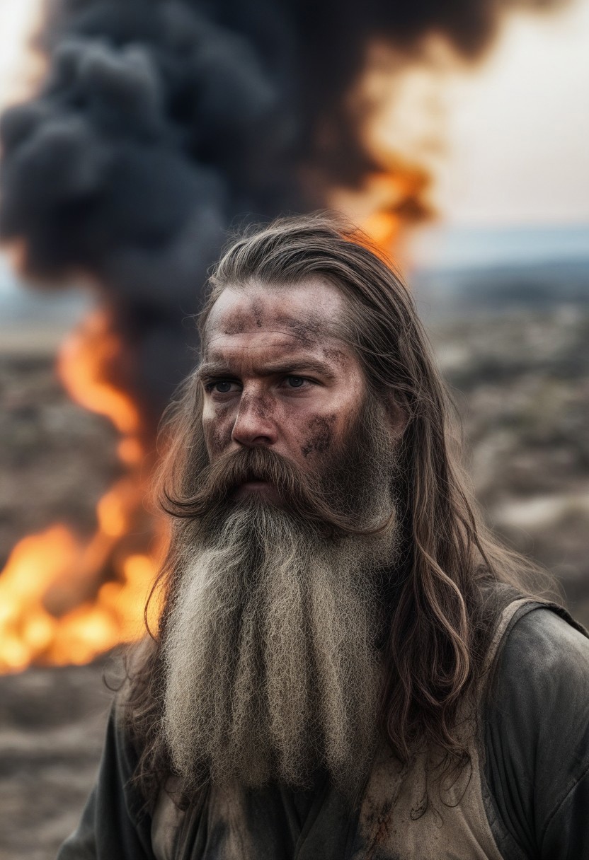 man long beard, dirty, long hair in background war landscape with flame and smoke