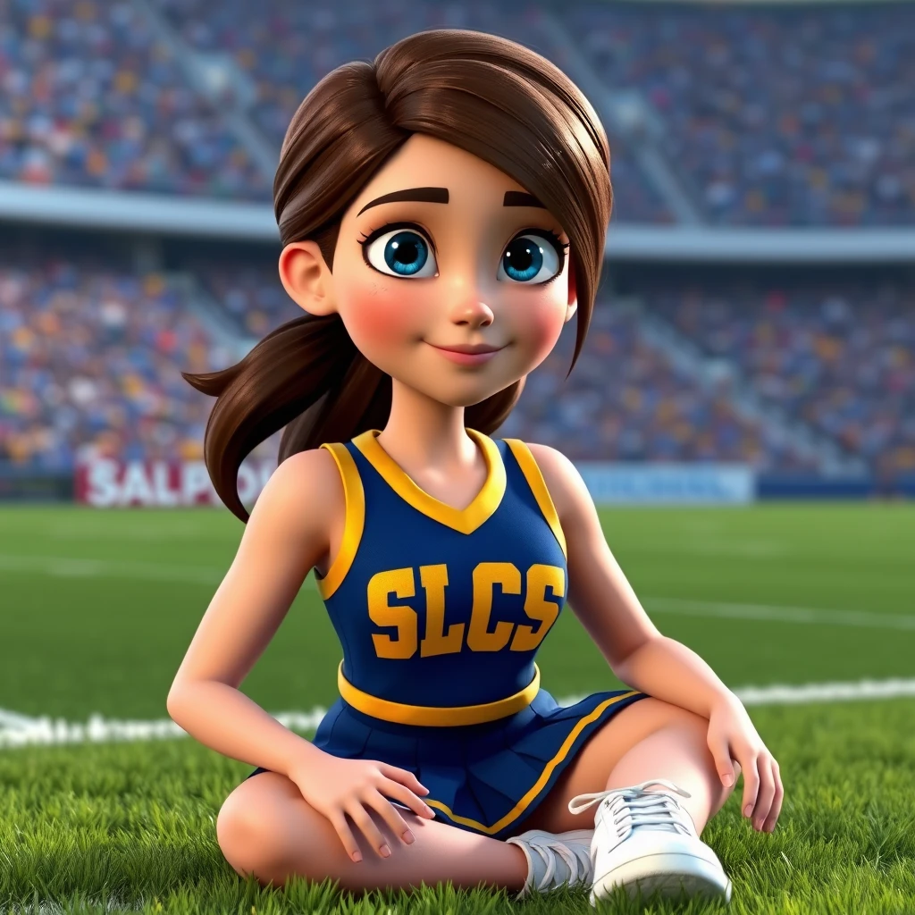 Disney Pixar 3d animated movie character. Real 3d style. Pretty brunette haired woman, big blue eyes. Pale skin. Attractive. Cheerleader uniform in blue and gold with the letters SLCS. Sleeveless top. Pleated skirt. White sneakers. Sitting on grass in a football stadium.