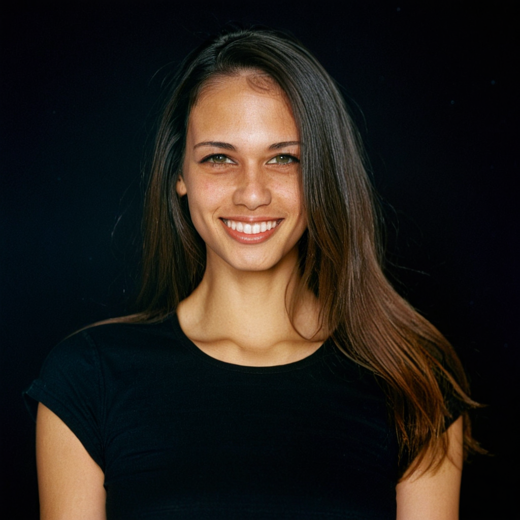 portrait photo of T1T0N, looking at viewer, straight hair, glamour makeup, smiling, black shirt, black background, shot on Kodak Portra 400 film