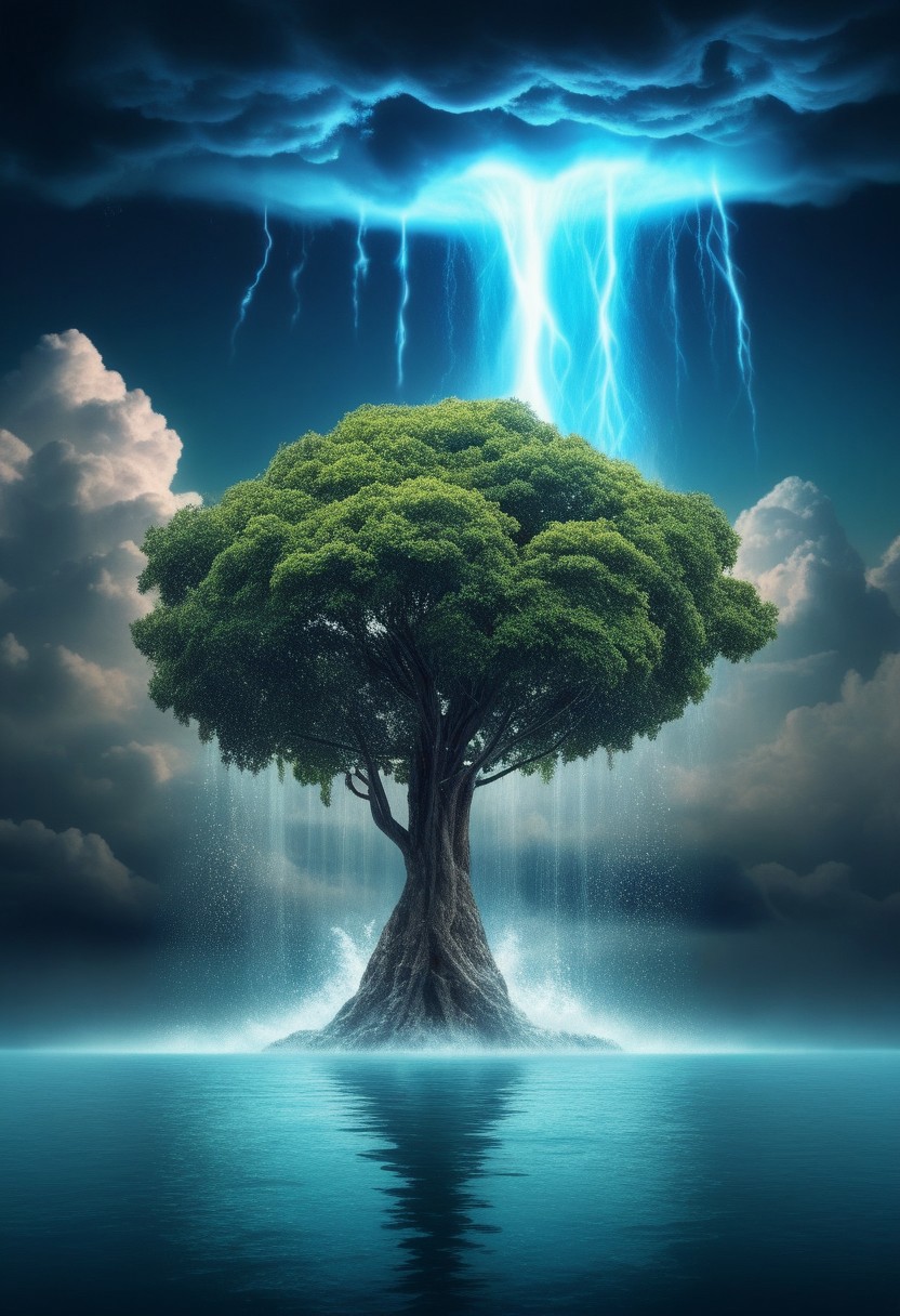 tree floating in the air with a waterfall falling from its roots in cumulonimbus clouds on planet earth, Leaves shaped like bioluminescence water drops.
