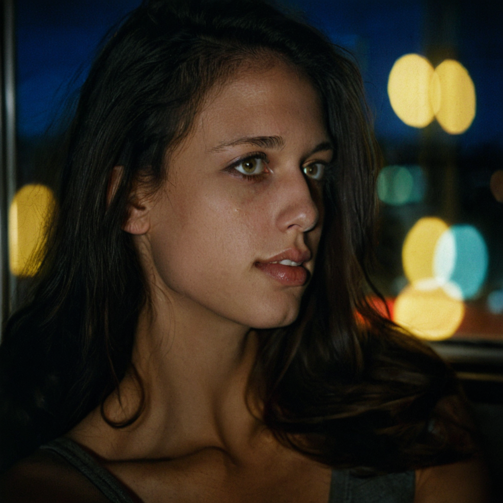 candid close-up photo of T1T0N, no makeup, looking outside the window, at night, blurred city lights, dark room, pensive expression, Shot on Kodachrome film