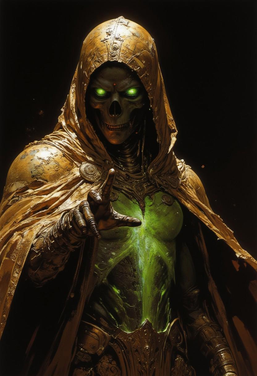 Subject: A spectral figure wrapped in a robe of gold foil that clings to its emaciated frame, the metallic fabric torn and weathered. Its face is a skull, partially gilded, with hollow eyes burning faintly with green fire. Pose: The Revenant stands motionless, its head tilted slightly to the side, one skeletal hand reaching toward the viewer as if inviting them closer. Lighting: A dim, flickering green glow radiates from its eyes and chest, casting uneven shadows. The gold foil reflects muted highlights, adding depth to its texture. Shot Type: A chest-up portrait, with the glowing eyes as the focal point and the hand slightly out of focus in the foreground. Technique: Blend sharp metallic highlights with soft, ethereal glows. Use subtle particle effects for flickering embers around the figure. Perspective: A slight fisheye lens effect, making the extended hand and glowing eyes feel unnervingly close.