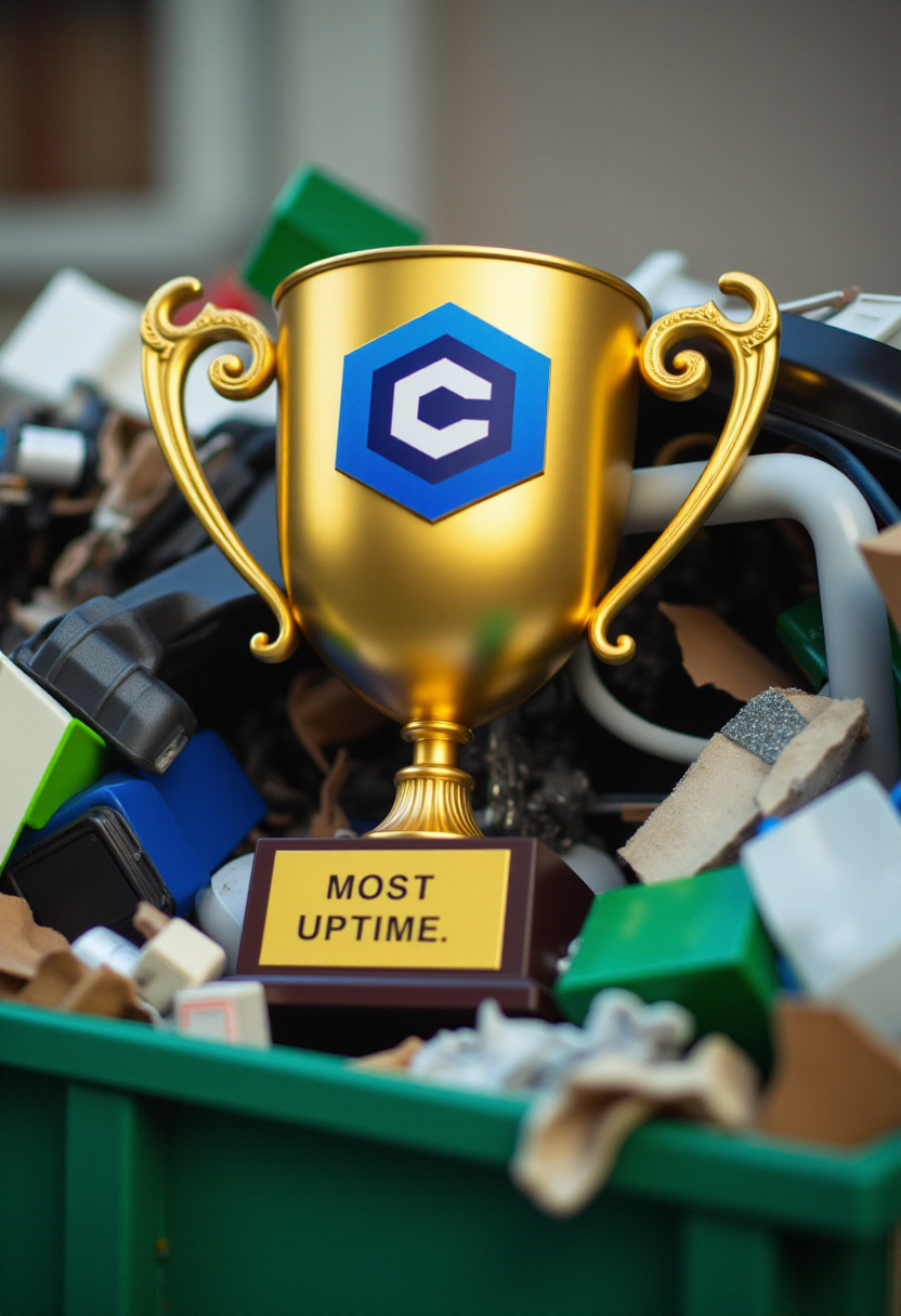 <lora:Trophytizer_FLUX:0.9> <lora:civitaiLogoFlux:0.75> This is a high-resolution photograph featuring a golden trophy with civitaiLogo embedded and nameplate text "Most Uptime" in a dumpster surrounded by trash.