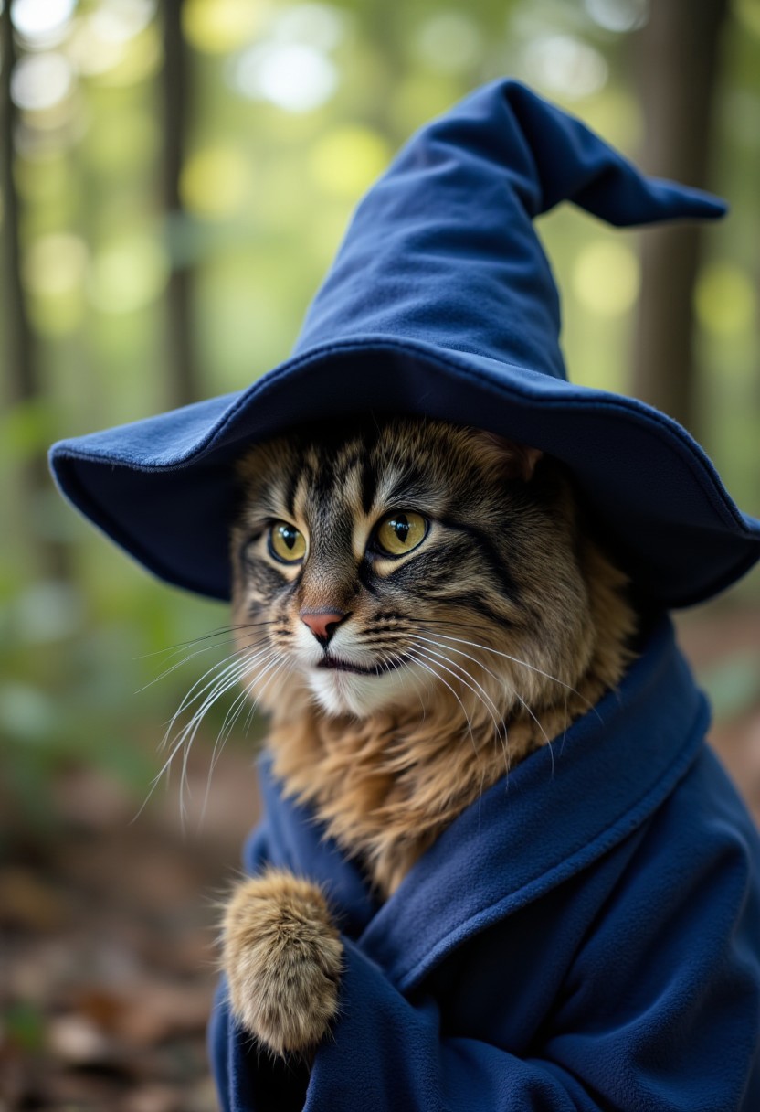 fluffy, medium-sized cat named Allie with a mottled coat featuring dark brown and black tabby stripes, wearing a blue wizard hat and robe, in a forest