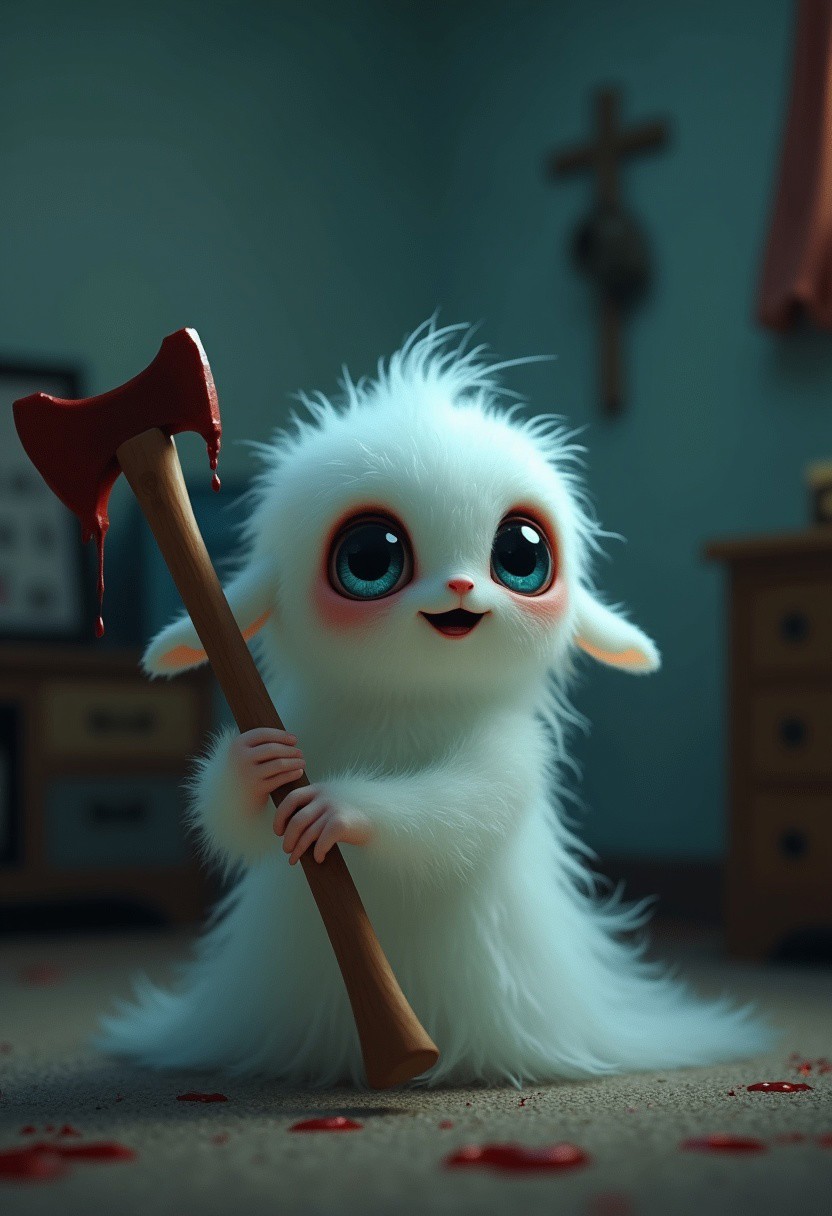 cute adorable, ghost-like creature with large, expressive eyes that capture a sense of wonder and curiosity. The creature's should be soft and illuminate , with shades of white that blend seamlessly with its dark surroundings. It is carrying an bloody axe in a teenager room