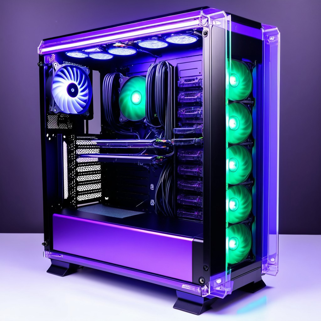 made of sparkling amethyst crystals, core_9, score_8_up, score_7_up, score_6_up, score_5_up, score_4_up score_9,score_8_up, gaming PC made of Illuminate Obsidian Jade, data center, motherboard, ram, cpu, cooler,green led, hard drive, cables,