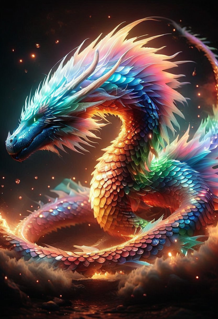 p1nk1r1sc4l3s, made out of iridescent scales,dragon,flaying at viewer,facing viewer, realistic, The background is the silhouette of a dragon emerges from the light, its form composed of the same vibrant energy. The entire scene is bathed in a contrast of deep blacks and brilliant scaled dragon, creating a dynamic and visually striking composition. Particles of light scatter through the air, adding to the mystical atmosphere. This digital illustration blends elements of anime artistry with futuristic aesthetics, resulting in a captivating image that radiates energy and intensity, snowing, , bright thunder, red fireflies lightning <lora:CyberRealistic_Negative-neg:1> <lora:patty_cake:1> <lora:detailed_notrigger:1> <lora:XL_boss_battle:1>