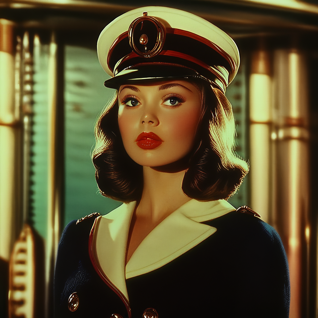 ArsMovieStill, movie still from a 1930s technicolor movie, The image shows a woman in a sailor's uniform standing in front of a ship wearing a cap and surrounded by various objects in the background., 1girl, hat, solo, red lips, upper body, brown hair, uniform, realistic, lips, blurry