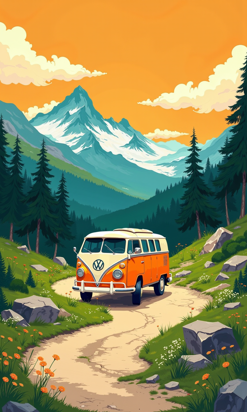 Full outdoor landscape scene, rendered in a flat, slightly stylized design. A vibrant orange-yellow sunset sky, with fluffy white clouds, dominates the upper portion. The backdrop features a majestic mountain range stretching across the middle ground. The mountains are depicted in shades of teal, blue-gray, and white, suggesting snow-capped peaks and lush valleys in between. A Volkswagen Type 2 camper van, in a warm, light orange-tan color, is positioned in the mid-ground on a winding, dirt road that cuts through greenery. The road is a light brownish-gray, and various sizes of rocks and stones are scattered around it, with patches of green grass and wildflowers growing alongside the path. Deciduous and pine trees surround the road, with various shades of greens, silhouetted against the mountains. The overall color palette suggests sunshine and warmth, highlighting the natural beauty of the scenery and peaceful journey. The composition is balanced, with the central focus on the Volkswagen bus. The style is reminiscent of a graphic design or illustration, rather than a photorealistic depiction. <lora:FLUX-daubrez-DB4RZ-v2:1> DB4RZ, DB4RZ style painting