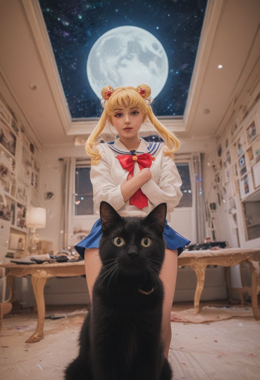 ((1Man Usagi Tsukino (Serena / Sailor Moon) with Luna the black cat !)) Perfect photograph, strong fisheye-lens photograph (intense fisheye-view photograph), strong bokeh, cinematic photograph, experimental angles, experimental lighting, intricately detailed, very detailed background, realisticvision-negative-embedding, epiCRealism