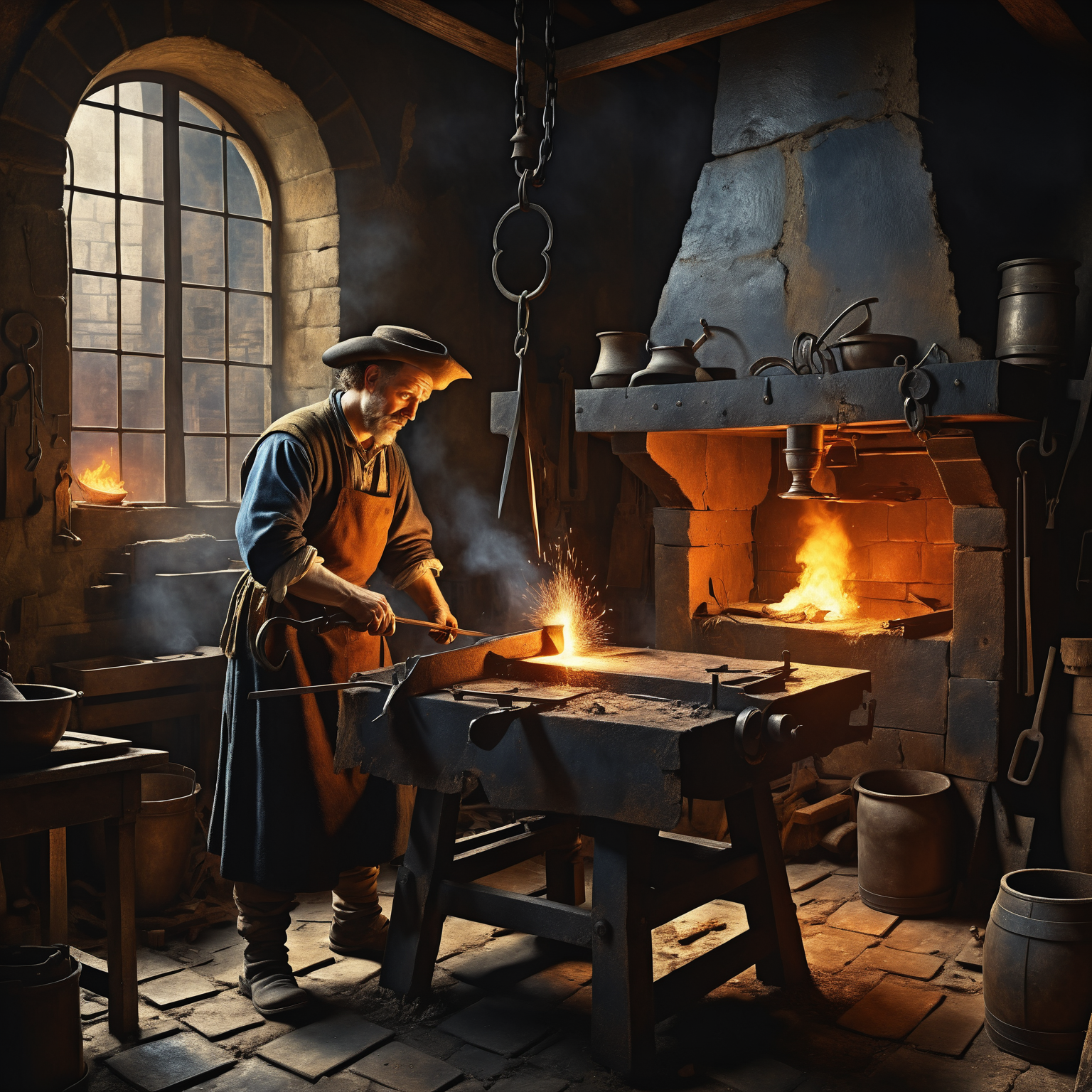 mysterious blacksmith in a baroque painting style, inspired by Jan Vermeer and Rembrandt van Rijn, historical art, oil painting, cinematic volumetric lighting, amazing details <lora:add-detail-xl:1>