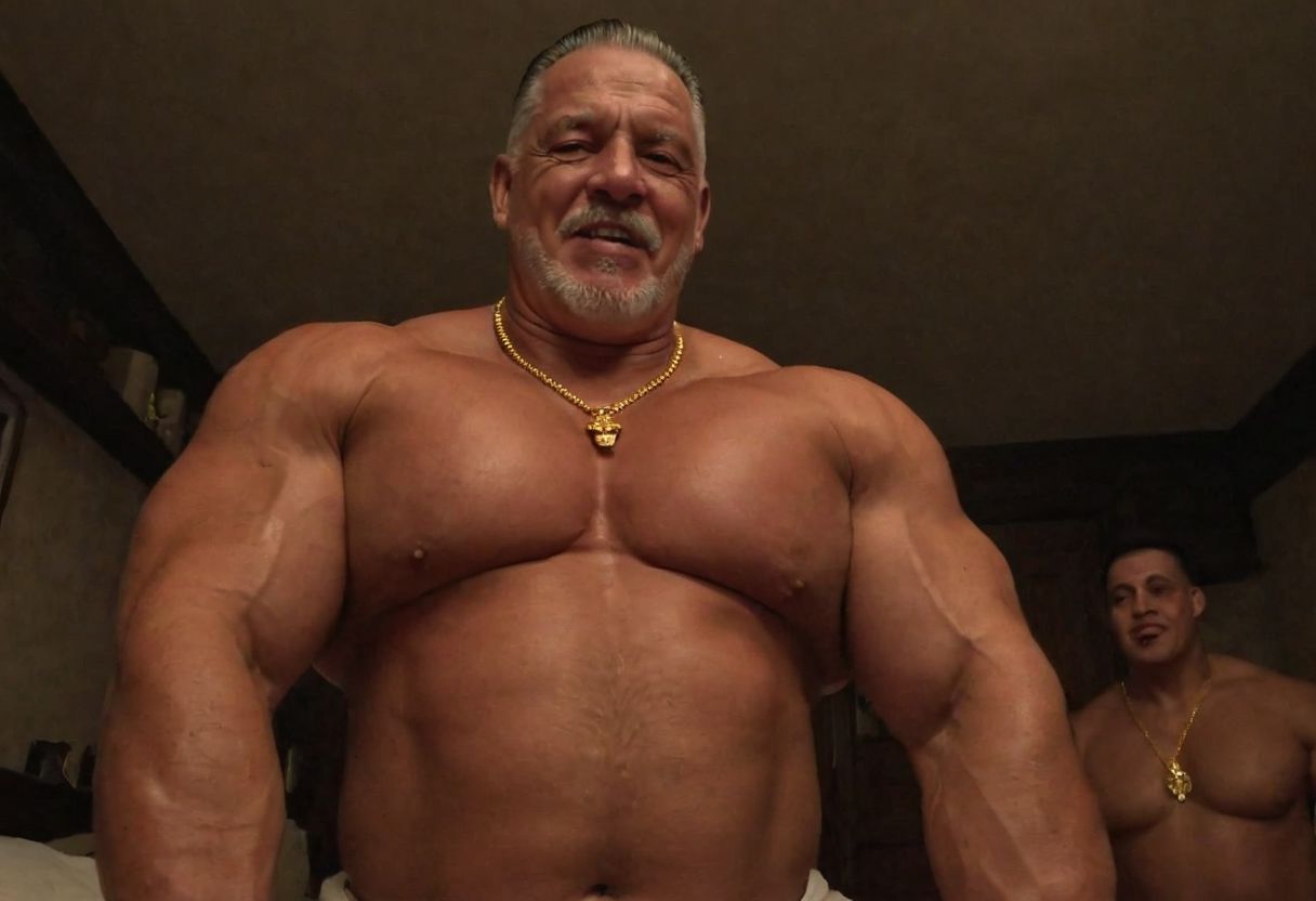 (photo, realistic, raw), (nighttime, at night, dark, dark hard shadows, cinematic atmosphere, movie grain, hazey atmosphere), gay porn, gay sex scene, closeup from below, focus on face, (brute, strongman, priest, european monk, cleric, holy, angelic, wise, gentleman, etherial, spiritual, emperor, king, god), old burly buff gentleman, goatee, old manly mature man, combed back hair, doublechin, old tanned grandpa, wrinkly neck, proud big chest, thick neck, armpits, tanned skin, tight golden spandex, gold jewellery, gold necklace, in a dark cloister bedroom at night, nighttime,looking directly at viewer with a loving caring smile, leaning forward close to viewer, very close, intimite situation, romantic atmosphere, intimate lustful romantic expression, sad expression, belly and pecs from below, sweaty oily oiled skin