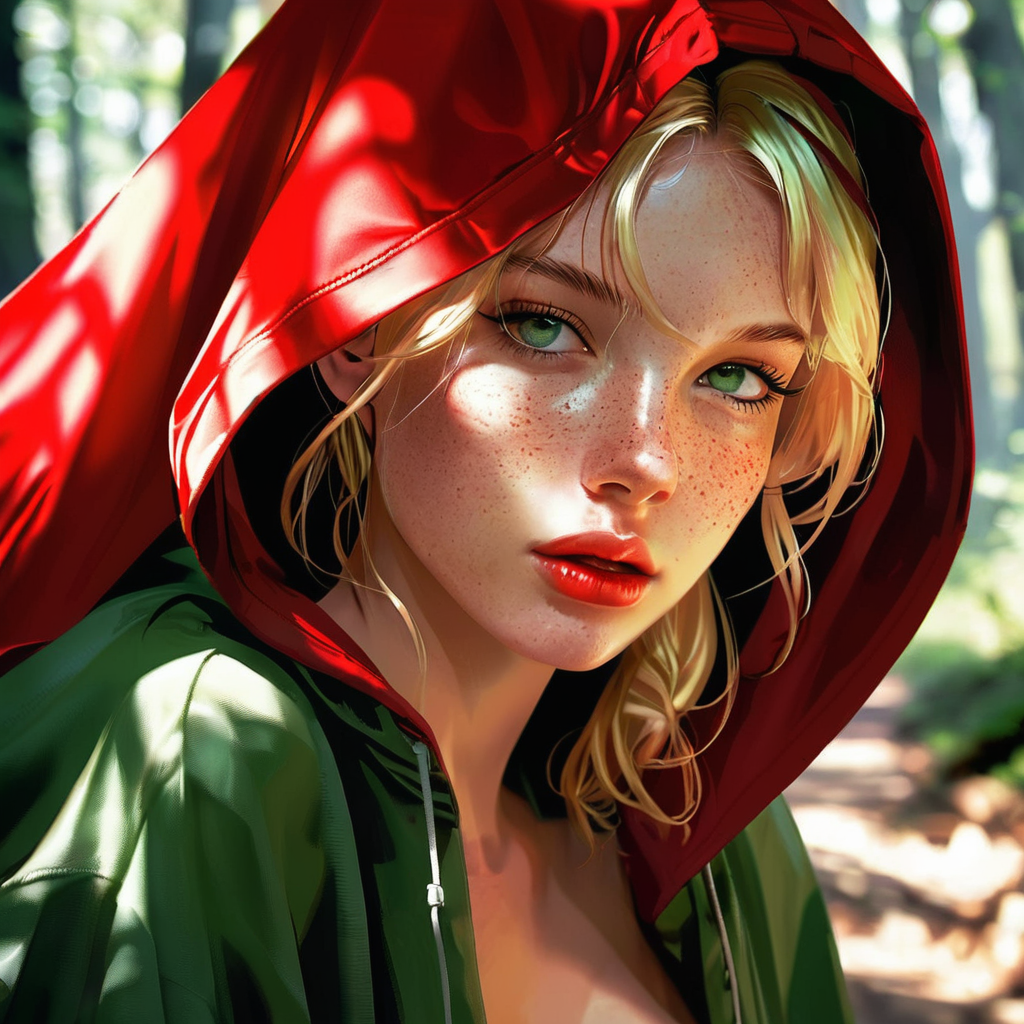 score_9, score_8_up, score_7_up, ( hooded face,face focus, eye focus), 1girl, freckles, slutty petite bombshell, mysterious smile, skinny, detailed skin, wearing a red hooded cape, hooded face, cape wrapped around her, sexy, big breast, blonde hair , ponytail, big pretty green eyes, innocent eyes, sexy, side view playful, forest path, dirt path, sunny day hike, concept art, cell shading, masterpiece, detailed face, beautiful, dark fantasy style, <lora:style_lora_adafactor:0.8>