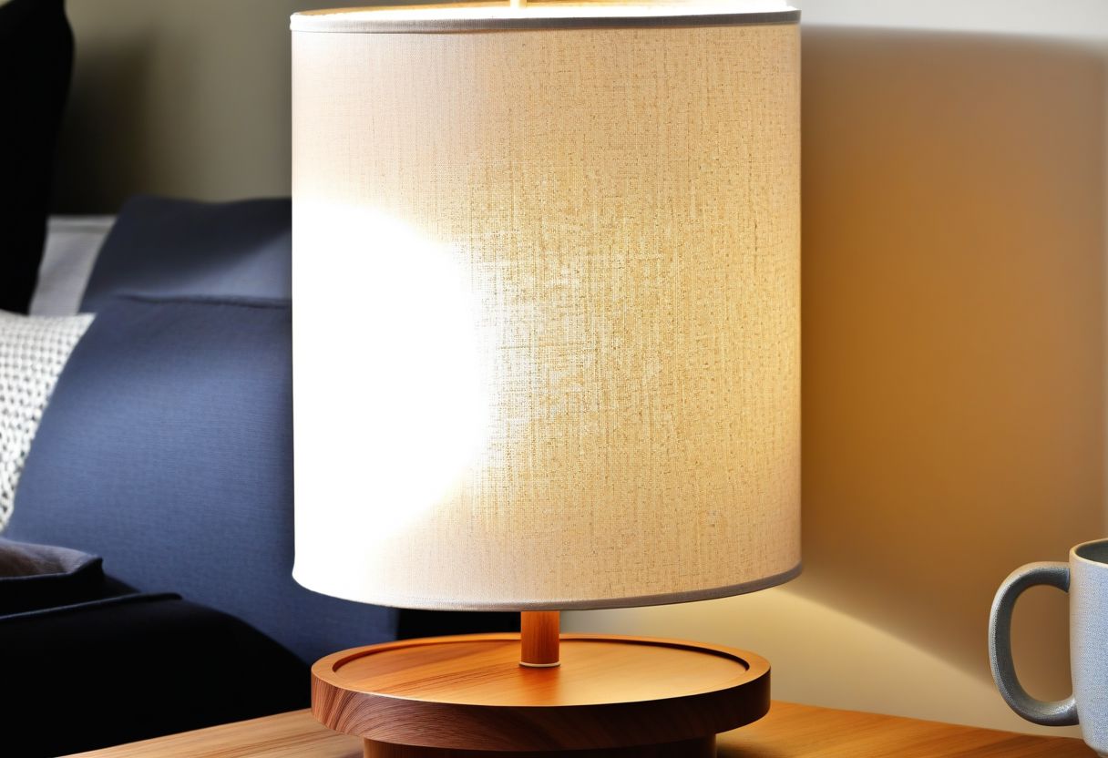 (Contemporary:1.5), (modern:1.5), (photographic:1.4), (ergonomic:1.3), (Bauhaus:1.4), Classic modern table lamp, table lamp design, hardwood wooden frame, dynamic geometric form, comfortable form, best quality, realistic, smooth surface finish, natural wood, natural materials, slender neck, facing viewer, calm lighting, semi detailed background, contemporary, furniture catalogue photograph, tasteful framing, tasteful layout, (end table:1.2), (coffee mug:1.2)