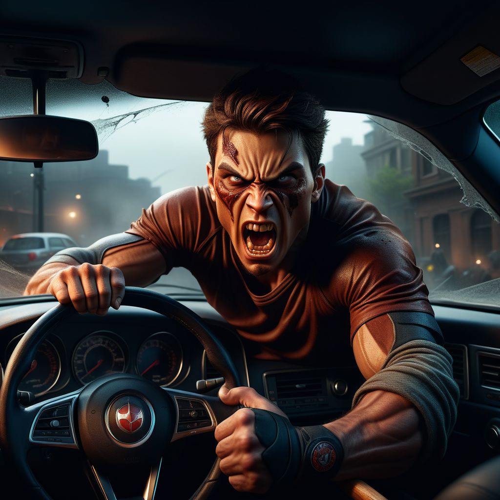 Ultra realistic color pencil image of an extremely angry young man breaking the windshield of a car with a baseball bat. BREAK Deep dark intense brown misty background, Dark theme, dynamic lighting, (soft shadows), (soft focus), (photo realistic), uhd, 8k