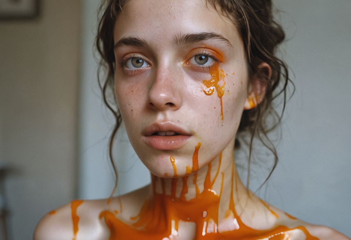 Ultra detailed film photograph with tiny depth of field, shot in an empty studio space with complex lighting. The bare bust of a beautiful woman, her hair and face and slender neck and delicate collarbone and small firm breasts. She looks stoic and severe, soft eyes that are perfectly in focus. Her mouth is overflowing with thick paint, From her lips flows richly orange colored paint, drooling and trickling from her lips down her chin, dripping on her tiny breasts, her erect nipples. trickling down her neck. Everything else slips out of focus. Surreal and artistic.