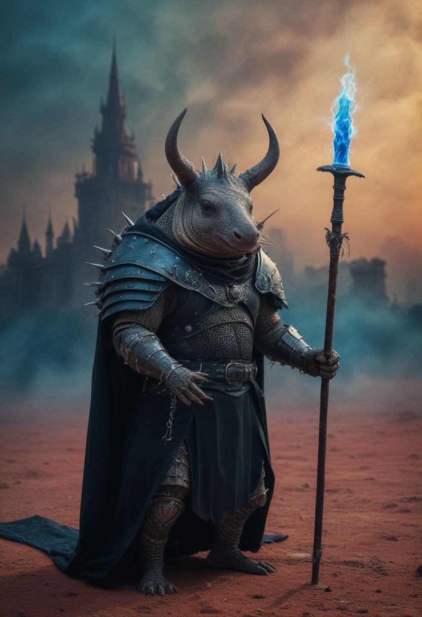 ((Full-length photograph / whole body photograph of the evil armadillo wearing long black sorceress robes with (silver spikes) and a (rod of blue fire) , standing in a faint red mist, with an (obsidian tower) behind it)), :BREAK: ((Perfect photograph, strong fisheye-lens photograph (intense fisheye-view photograph), strong bokeh, cinematic photograph, experimental low angles, cinematic heaven, warm angelic lighting, intricately detailed, very detailed background, realisticvision-negative-embedding, epiCRealism ))