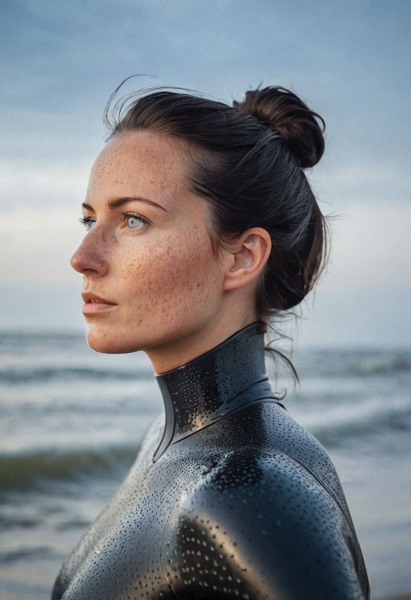 Stunning analogue photo of a beautiful 38 years old Dutch woman, sideview, making a selfie to send to her boyfriend, wetsuit, perfect face, absolute beauty, sexy pose, natural raven black hair, ponytail, blue eyes, freckles, freckles and moles all over body, absolute perfect tits, big tits, soft natural tits, in the surf, at the Dutch coastline, early morning, very foggy, soft natural early morning light, ultra realistic, extremely detailed