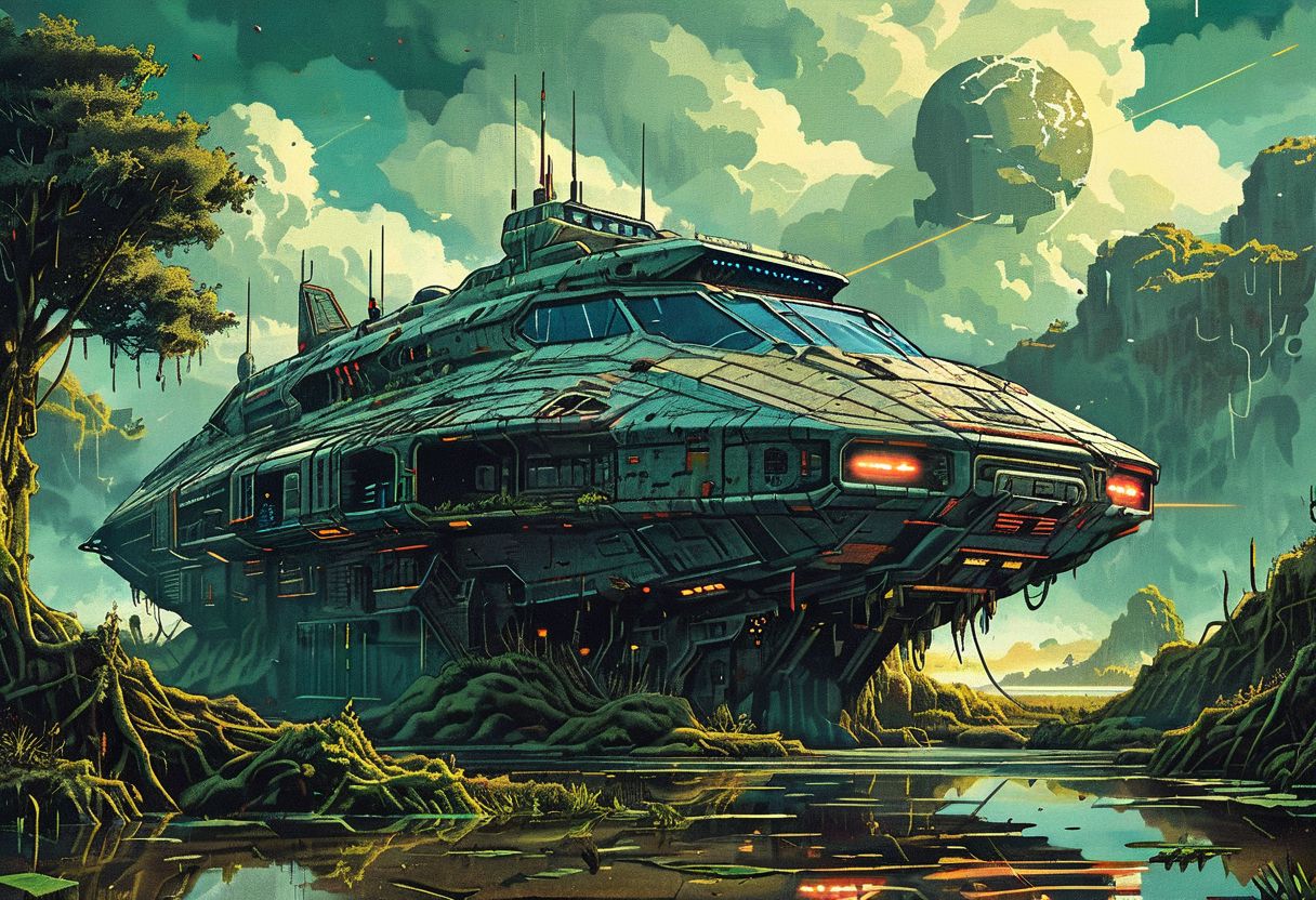 book cover, Retro futuristic Image, a huge spaceship (long abandoned) in a swamp, half submerged, sharp, high detailed, realistic,