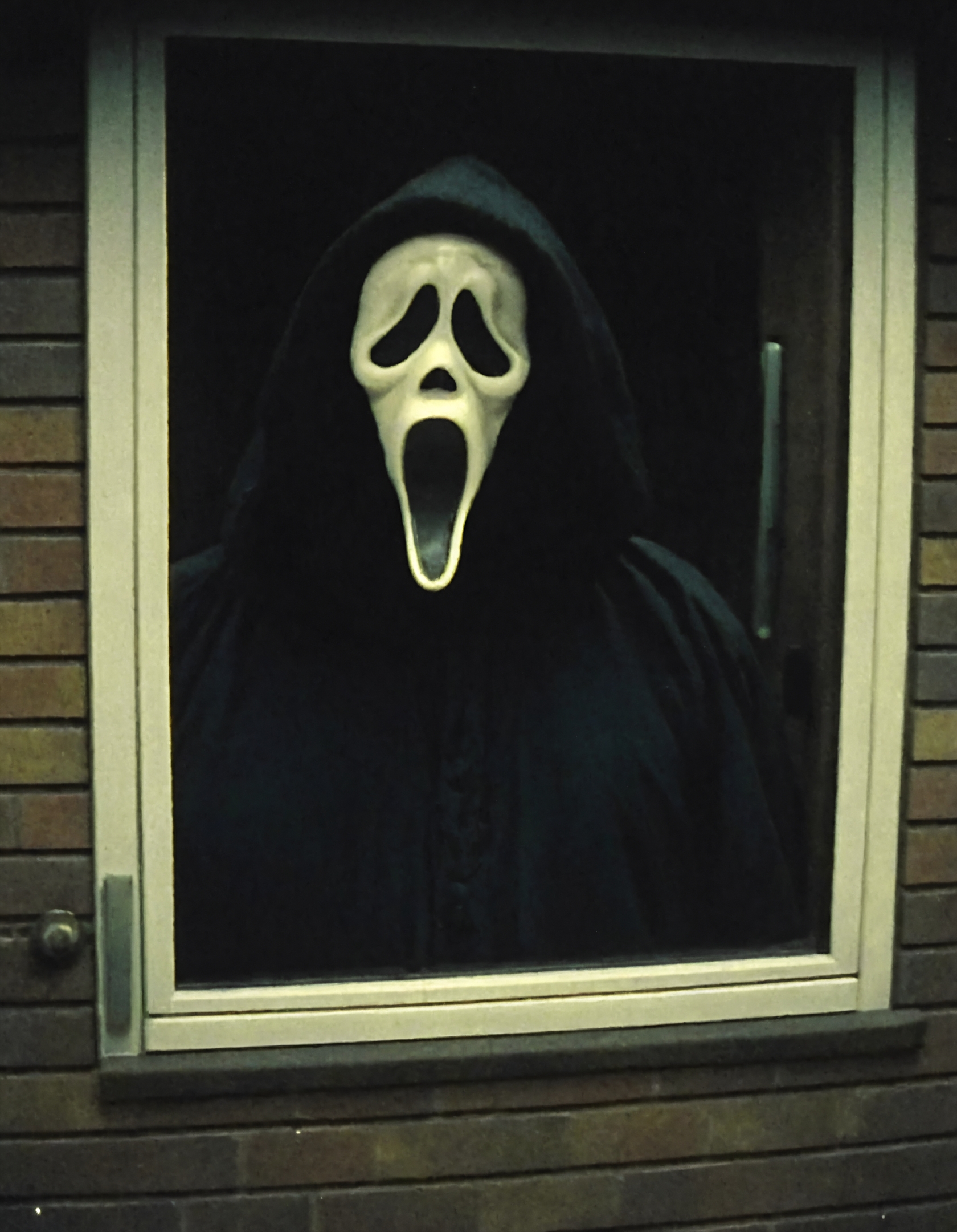 a cctv blurry image,high-angle,taken from a monitor,showing Ghostface from a doorbell view outside a house,vhs filter,(low resolution:1.3),grainy,eerie,horror,dark