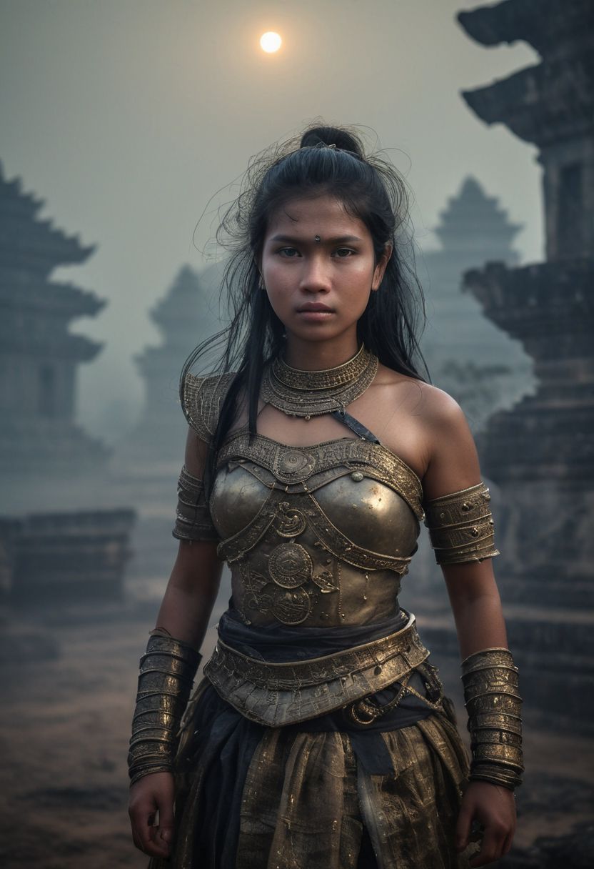 Close Up shot of Raya from the ancient cambodian tale as a princess warrior, she IS a very beautiful girl, black hair, beautiful, ancient cambodian armour, dirt clothes, wind, at night, fog, mist, interior of an ancient cambodian temple at the background, National Geographic photography awarded masterpiece