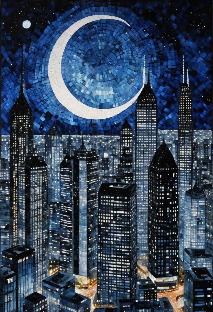 [glass mosaic : washed watercolor painting <lora:Night Sparkle:1.0> : 0.5] a great modern metropolis at night viewed from above; moon, skyscrapers; blue and black