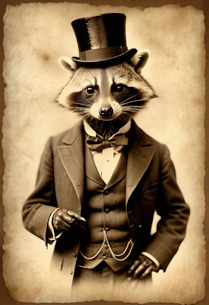 dapper anthropomorphic raccoon, top hat and monocle, in the style of olan mills photography, 1920's style photograph, sepia tone, damaged photograph printed on parchment paper, dirty photograph