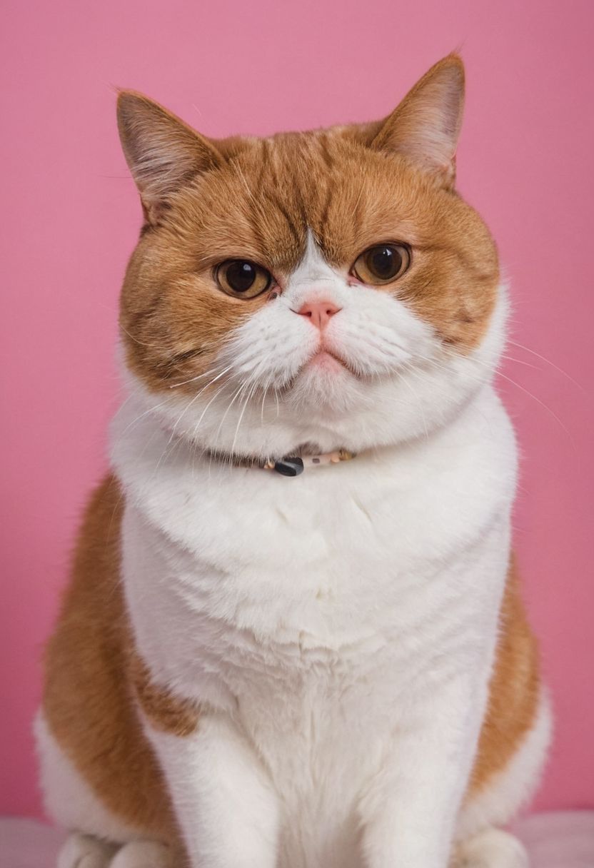 red velvet background, photograph of a overweighted extremely fat male beautiful exotic shorthair cat, white and tabby cat, standard ears, stanard head, extremely fat, strong and muscular , round eyes, pink nose, round pupils, high contrast, ray og light, light on the eyes, hard shadow, ENF, Embarrassed, Covering,