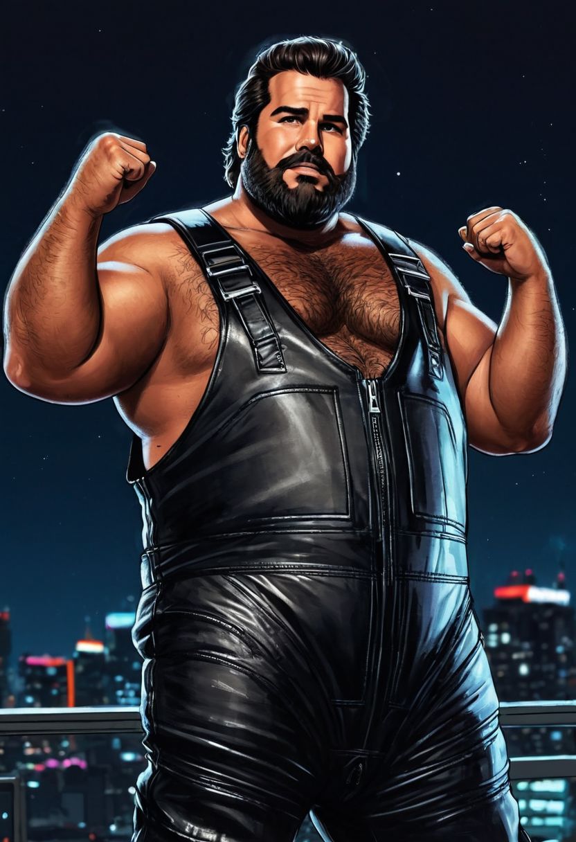 (photo, realistic, raw), (nighttime, at night, dark, dark hard shadows, cinematic atmosphere, movie grain, hazey atmosphere), videogame character select, rpg videogame, dark fantasy comic, scribble, colored sketch, gay bara manga, cinematic atmosphere, dark shadows, old chubby hairy man, broad round manly face, puffy cheeks, wide chin, stubble, tanned skin, hairy chest, wearing an open leather business overall with open zipper, fist up, cool posture, synthwave aura, space station background